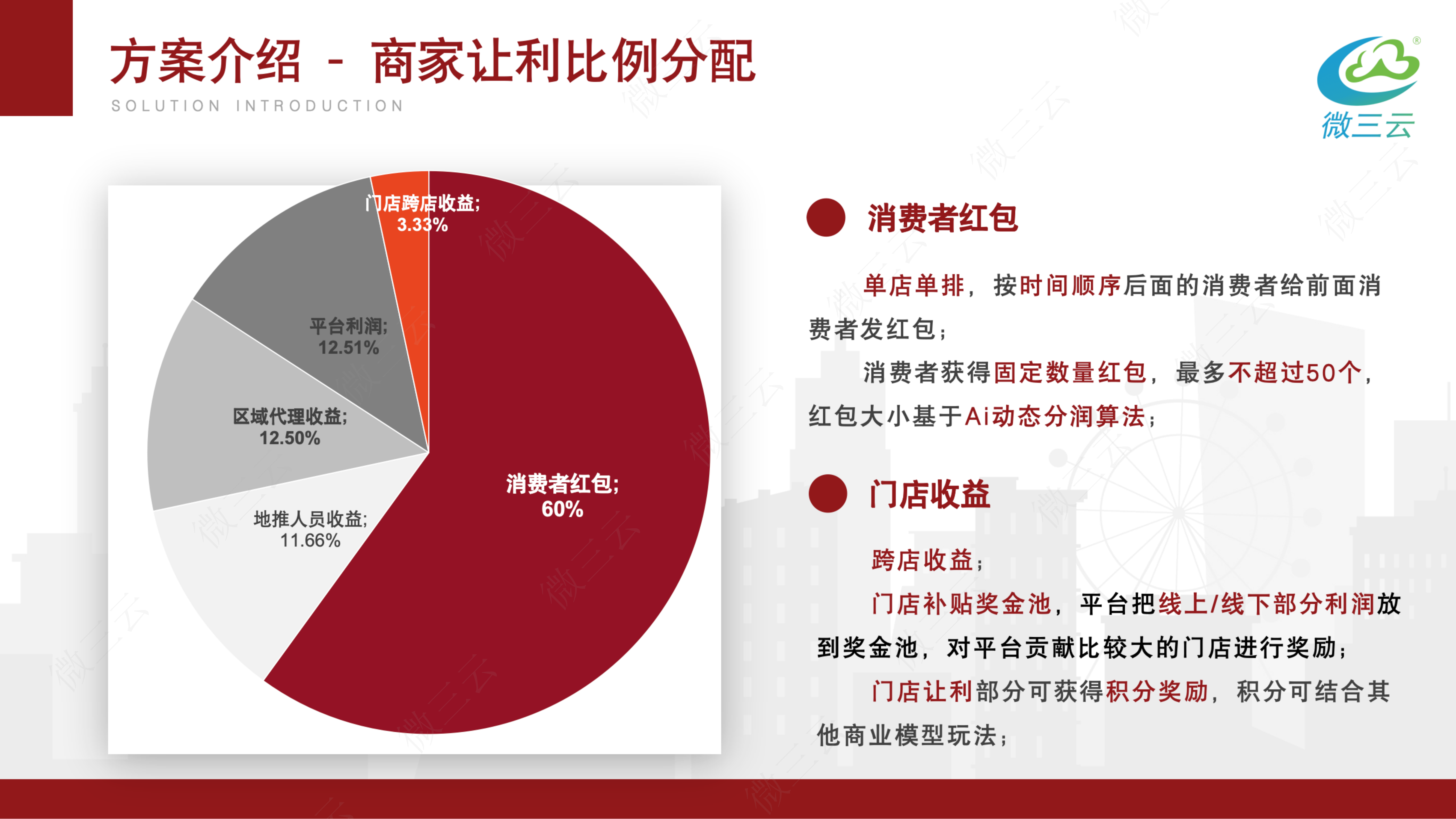 商家让利金额的50%进入红包池,平台保留其中一部分用于运营和推广;剩余50%用于发放给用户。平台从中抽取0.4%7.4%作为利润,同时承担资金分账与风险控制。