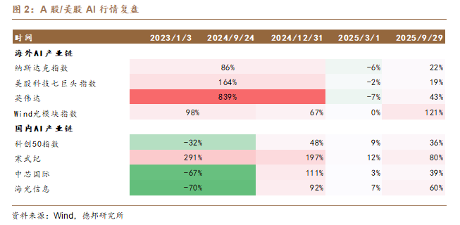 2023年初至2024年底,万得美国科技七巨头指数(MAGS)涨幅达到163.84%,带动美股纳斯达克指数同期上涨85.91%。其中英伟达作为AI时代的“卖铲人”最为受益,其股价同期涨幅达到838.79%,营收从2023年财年的269.74亿美元跃升至2025财年的1304.97亿美元。而彼时国内相关产业链并不成熟,A股市场的选择更多集中在光模块、服务器等配套环节,2023年初到2024年9月24日,Wind光模块指数涨幅达到98.20%,相比之下科创50指数则下跌31.93%。