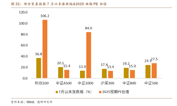 价格端的企稳回升不仅是短期市场波动的结果,更是市场对于供需关系改善与产业结构优化的预期集中体现。随着无序扩张的产能逐步出清,行业集中度提升,价格下行压力得到缓解,市场信号开始由“恶性竞争”转向“价值回归”。这一变化在企业层面表现为利润率和现金流的修复,在宏观层面则强化了对经济韧性和增长前景的信心。当盈利预期稳步改善,资本市场的风险溢价自然趋于收窄,投资者风险偏好得到提振,进而推动估值体系逐步修复。这一传导链条表明,价格修复不仅是行业层面的良性循环,更是资本市场回暖的重要前提和宏观经济转型中的关键环节。以宽基指数的涨跌情况和估值变化为例,7月以来科创100指数涨幅最高达36.8%,同时PE估值也达到了106.2倍,显示出股票市场对于科技类高估值板块的偏好。