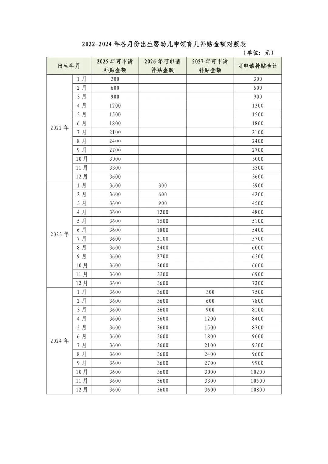 (2)2022年1月至2024年12月出生的婴幼儿,可按应补贴月数折算补贴金额,具体算法见下表。