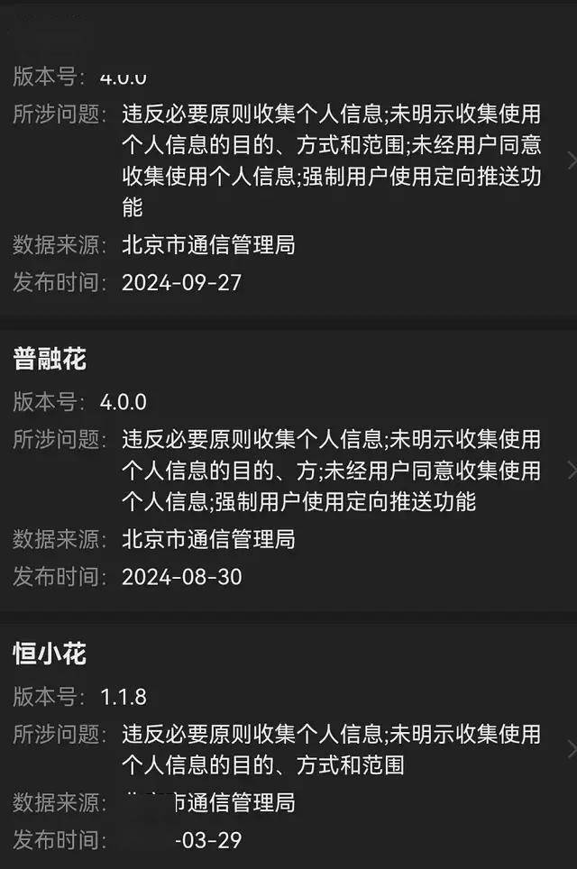 北京市通信管理局发布的通报显示,“普融花”APP多个版本存在严重违规收集个人信息问题,包括“未经用户同意收集使用个人信息,未明示收集使用个人信息的目的、方式和范围,违反必要原则收集个人信息,强制用户使用定向推送功能”等“四宗罪”。