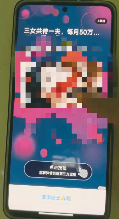 根据多位用户的反馈截图和视频,问题主要集中在宝宝巴士的安卓客户端。用户打开APP时,出现了极具诱导性的开屏广告。打开宝宝巴士,弹出的页面显示:“三女共侍一夫,每月50万生活费”,根据一位用户出示的录屏画面,一名穿着暴露的女士躺在床上,嘴里塞着红布。令家长愤怒的是,此类广告的设计极具欺骗性。当用户试图点击“关闭广告”,却往往会触发进一步的跳转,如引导至短视频平台的美女跳舞视频、诱导下载不明软件,或进入“黑”等页面。
