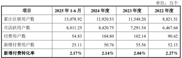 付费转化率则从2022年的1.03%下滑至2024年的0.75%,到今年上半年仅有0.36%。