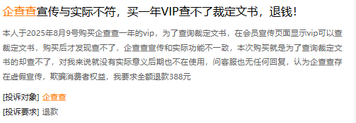 在黑猫投诉平台上,涉及企查查的消费者投诉量累计2654条。不少消费者投诉企查查“涉嫌诱导消费”、“不退款”、“宣传不实”、“VIP内容与普通用户内容相差不大”等情形。