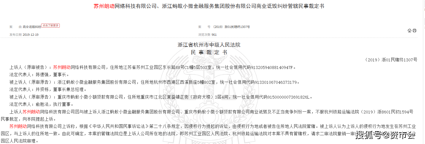 此次“乌龙”事件也让企查查与蚂蚁金服对簿公堂。蚂蚁金服(浙江蚂蚁小微金融服务集团股份有限公司)、蚂蚁微贷(重庆市蚂蚁小微有限公司)主张企查查(苏州朗动网络科技有限公司)实施了商业诋毁及不正当竞争行为。