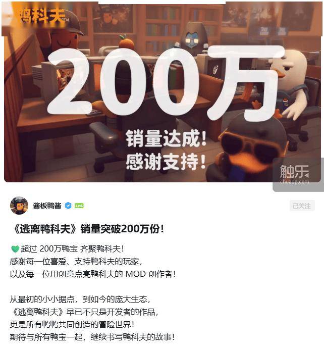 10月28日,由碳酸小队开发、B站发行的PvE搜打撤游戏《逃离鸭科夫》官宣销量突破200万份。