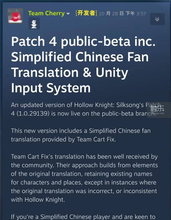 10月28日,《空洞骑士:丝之歌》的开发商Team Cherry公布了游戏的第4版公开测试补丁,本次测试集成了由粉丝汉化团队“修车组”(Team Cart Fix)制作的简体中文翻译,Team Cherry表示,该汉化版本参考了游戏的现有英文文本和系列设定,致力于保证术语的准确性以及与《空洞骑士》前作的一致性。