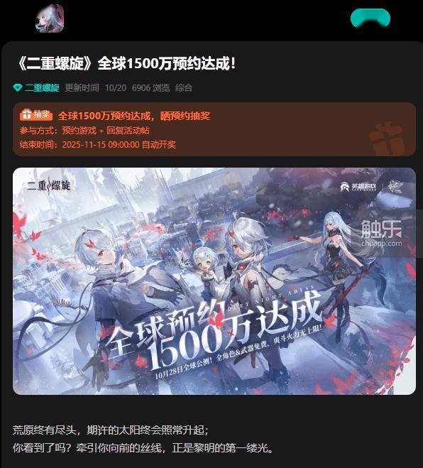 据官方数据显示,10月20日,《二重螺旋》官宣全球累计预约突破1500万,全渠道社媒关注突破520万。在预下载开启后,游戏迅速登顶多个国家及地区App Store免费榜榜首,显示出极高的市场期待度。