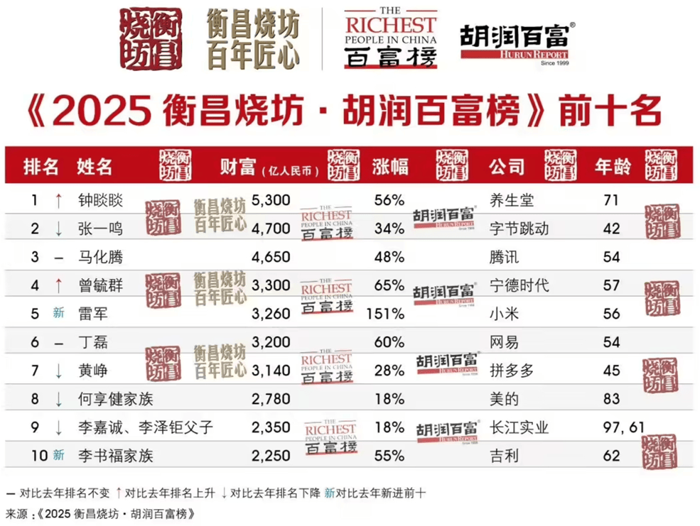 字节跳动创始人张一鸣以4700亿元排名第二,增长1200亿元;腾讯CEO马化腾以4650亿元位列第三,增长1500亿元;网易创始人丁磊(3200亿元)位列第六,增长1200亿元;米哈游创始人蔡浩宇(810亿元)位列第60名。马化腾、张一鸣、丁磊均登上年度财富增长TOP10榜单。