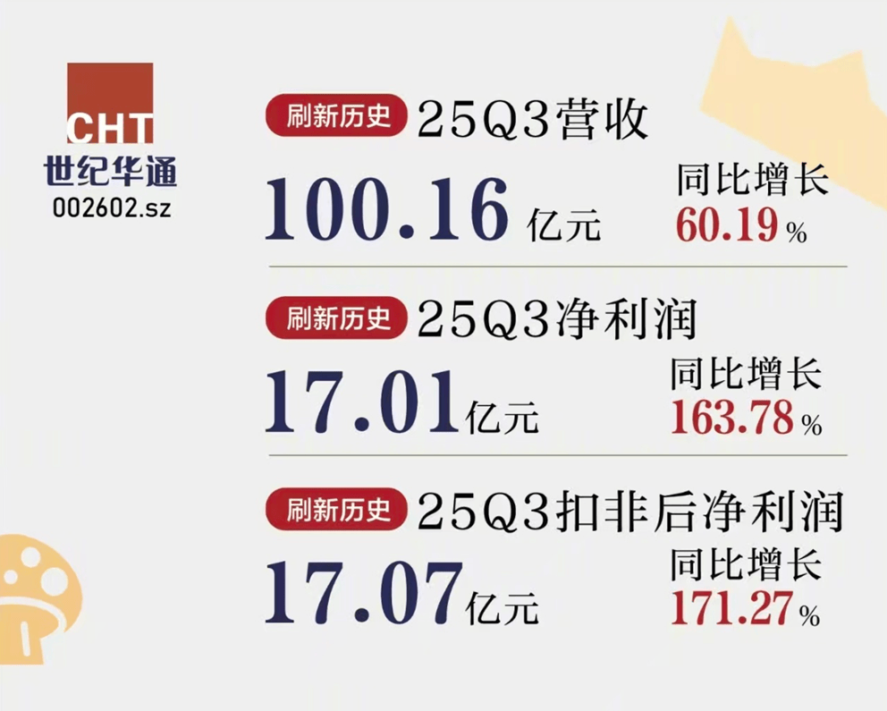 近日,世纪华通披露2025年三季报。数据显示,世纪华通第三季度实现营收100.16亿元,同比增长60.19%;净利润17.01亿元,同比增长163.78%;扣非后净利润17.07亿元,同比增长171.27%。截至目前,世纪华通达成季度营收“十连升”,同时单季度营收首次突破百亿规模,收入利润共创新高。