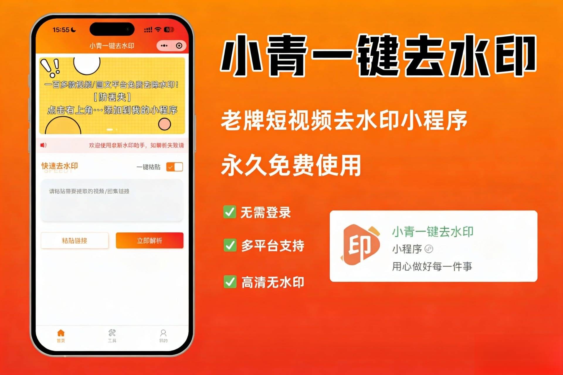 同样是微信小程序家族的优秀成员,小青去水印将“轻量便捷”做到了极致。它不占用手机存储空间,随时在微信里唤醒使用,特别适合手机内存紧张的用户。它的解析效率同样出色,粘贴链接后能快速完成任务。