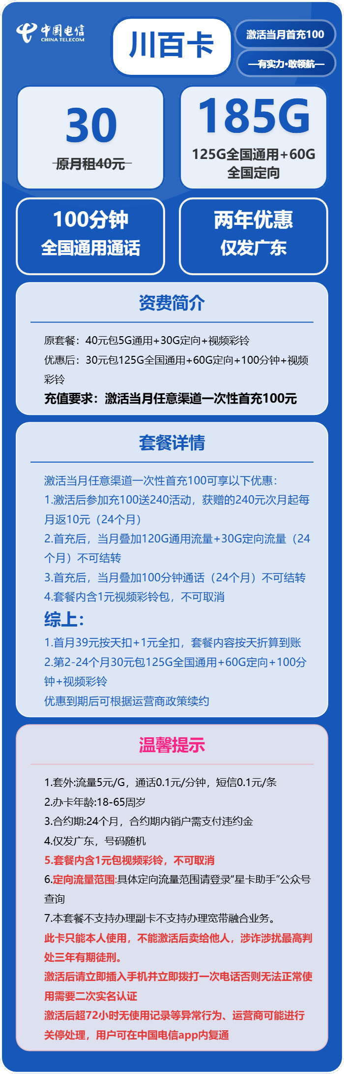 适合预算有限、流量需求中等的广东用户,30元月租就能享受185G流量,不管是日常通勤还是居家使用,都能满足需求,性价比直接碾压同价位其他套餐。