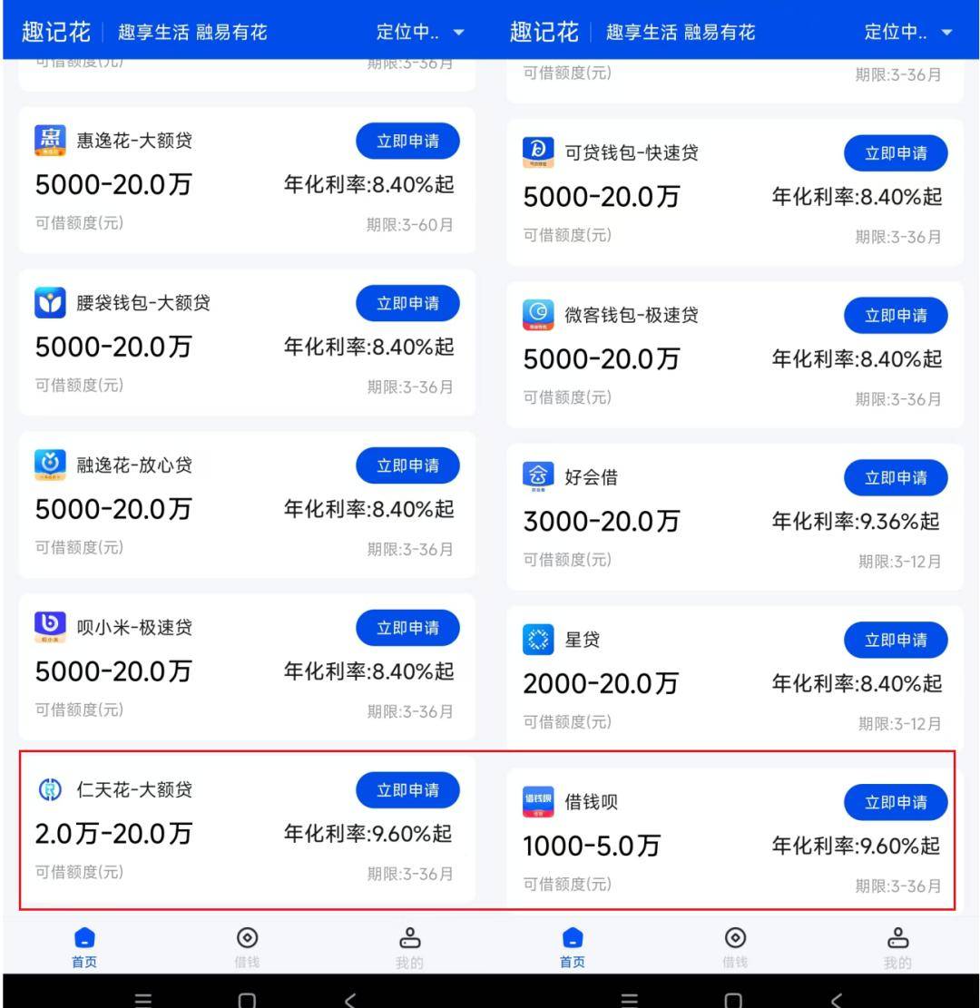 除了“仁天花”、“借钱呗”,趣记花还为钱来顺(丽水佳恒融资担保有限公司)、融优推(成都市天府利星科技有限公司)、云微融——国润建融信息科技(上海)有限公司)、叮咚金融(东兰县泓诚有限公司)、惠逸花(重庆市两江新区长运有限公司)、腰袋钱包(广州萤火数字科技有限责任公司)、融逸花(成都优卡数信信息科技有限公司)、呗小米(四川荟信数科网络科技有限公司)、云薪花(海南辉仁投资有限公司)、盈点分期(广州市汇融帮有限公司)、心享花(贵州铭成有限公司)、可贷钱包(成都巨芒信息科技有限公司)、柚米花(成都木子栗科技有限公司)、村村花(合盈(重庆)有限公司)、微客钱包(哈尔滨市元丰股份有限公司)、星贷(重庆市渝中区科融有限责任公司等超20个借款平台引流。