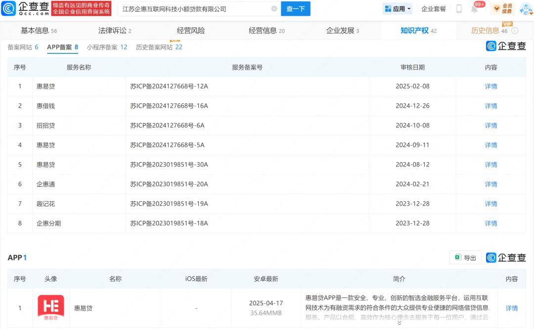 企查查数据显示,目前,企惠小贷旗下只开发运营了“惠易贷”APP,但2023年12月28日,企惠小贷备案审核通过了“趣记花”APP。