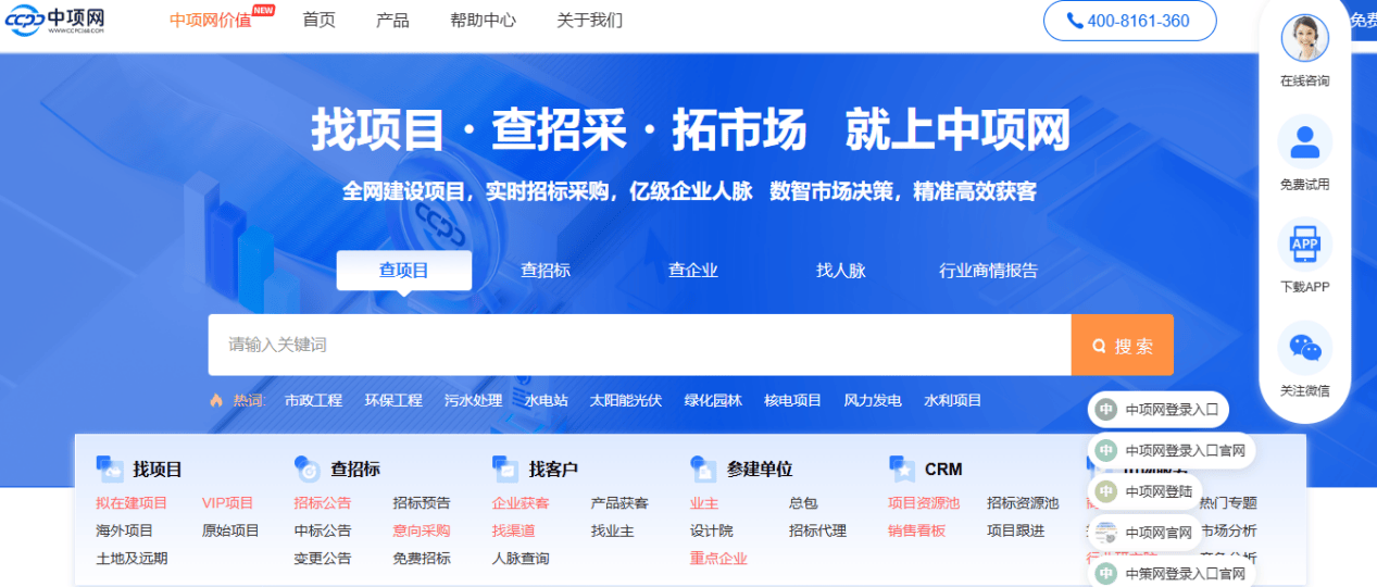 中项网成立于2007年,虽运营时间较长,但近年来因强化前期项目信息挖掘而被视为新晋特色平台。平台专注于工程与物资采购的早期阶段,服务过中石油、中建集团等大型企业。