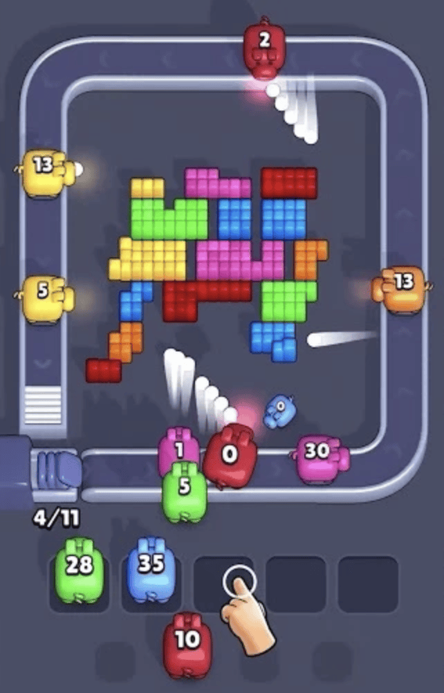 《Pixel Flow! 》是一款混合休闲益智游戏,其核心玩法将传送带机制与自动射击和策略消除结合,玩家需要合理安排颜色匹配与队列顺序以清除像素方块。因此,游戏在传统三消玩法之上增加了策略深度和节奏感。
