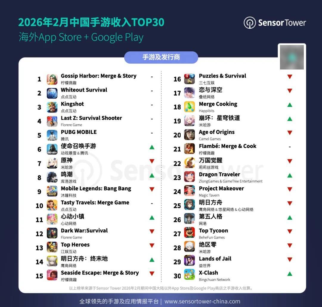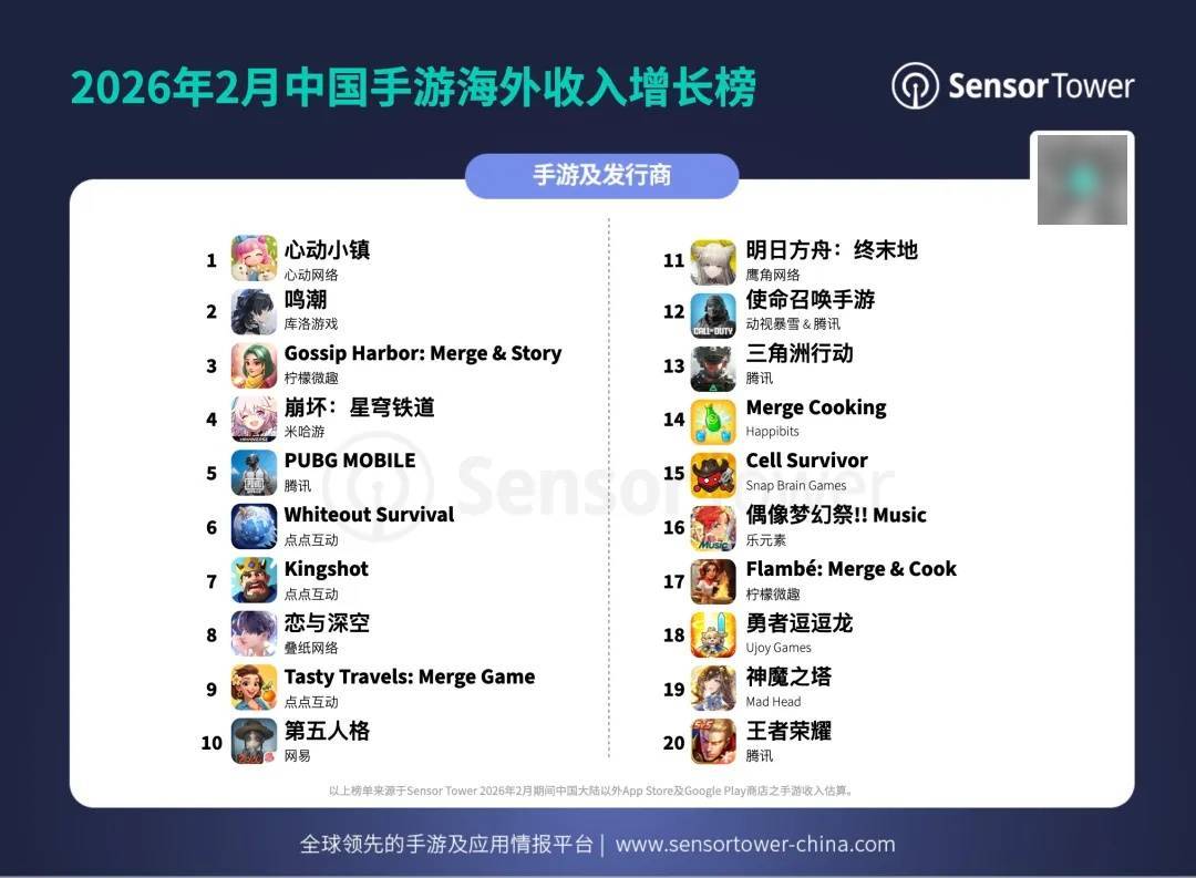 8位,其中《鸣潮》2月海外收入环比激增130%,新版本限定角色“爱弥斯”成为了营收增长的核心推力,游戏截至2月底全球累计流水已正式突破5亿美元。《心动小镇》排在榜单第