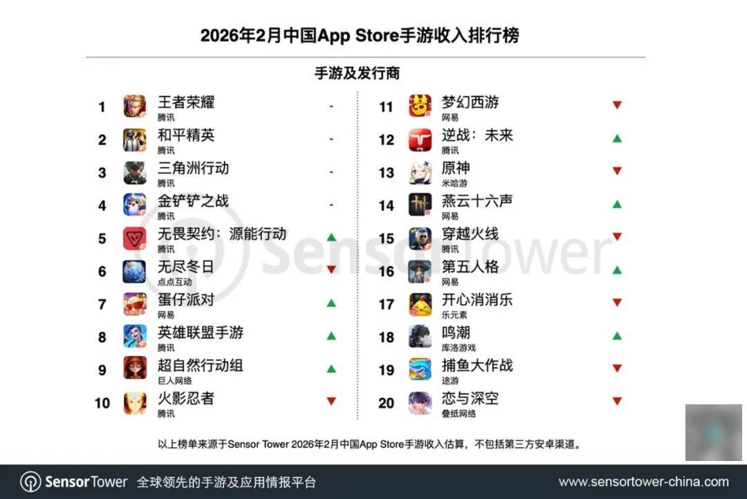 2026年2月中国App Store手游收入榜TOP20变化不大,老牌产品依然展现着绝对的号召力,其中腾讯旗下产品共有9个,《王者荣耀》《和平精英》《三角洲行动》《金铲铲之战》和《无畏契约:源能行动》将TOP5包揽。