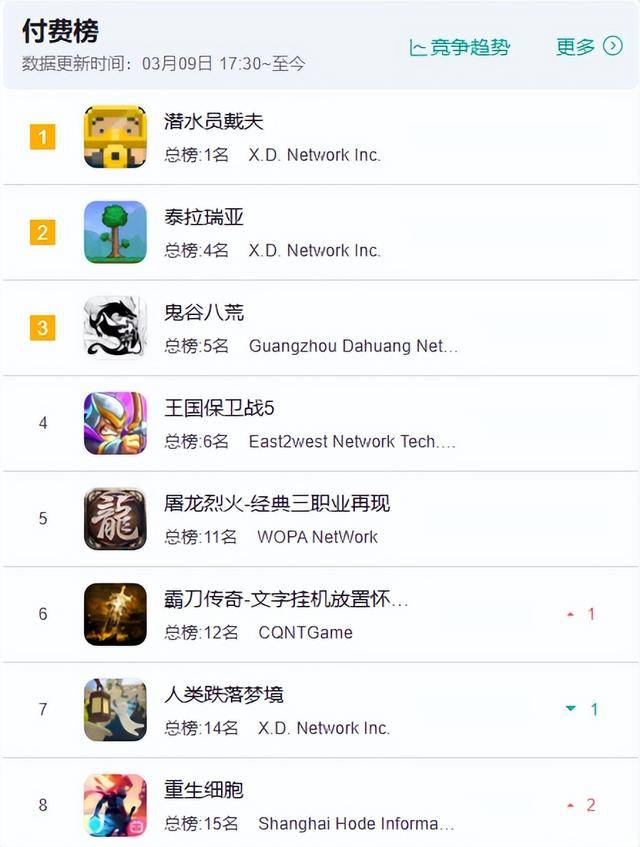 GameLook平常在统计每月新游的时候,经常会看到心动发行的Steam独游产品的手游移植版。而翻开现在的iOS付费榜,就会发现前十名中心动占据了三款(《潜水员戴夫》第一、《泰拉瑞亚》第二、《人类跌落梦境》第七)。