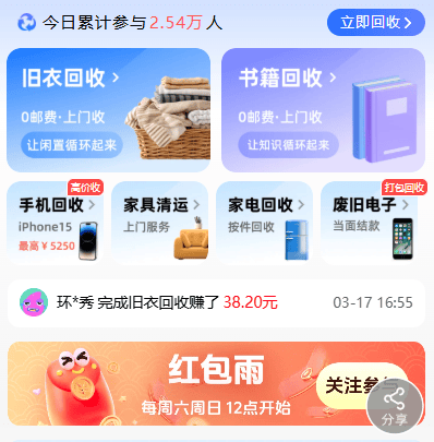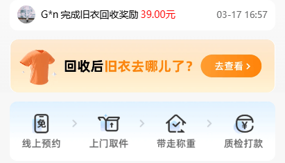 核心模式:用户预约上门回收旧衣,完成取件后获得环保积分,积分可在平台商城兑换洗衣液、纸巾、餐饮券等实用好物,长期联动正规公益组织,主打环保公益属性。