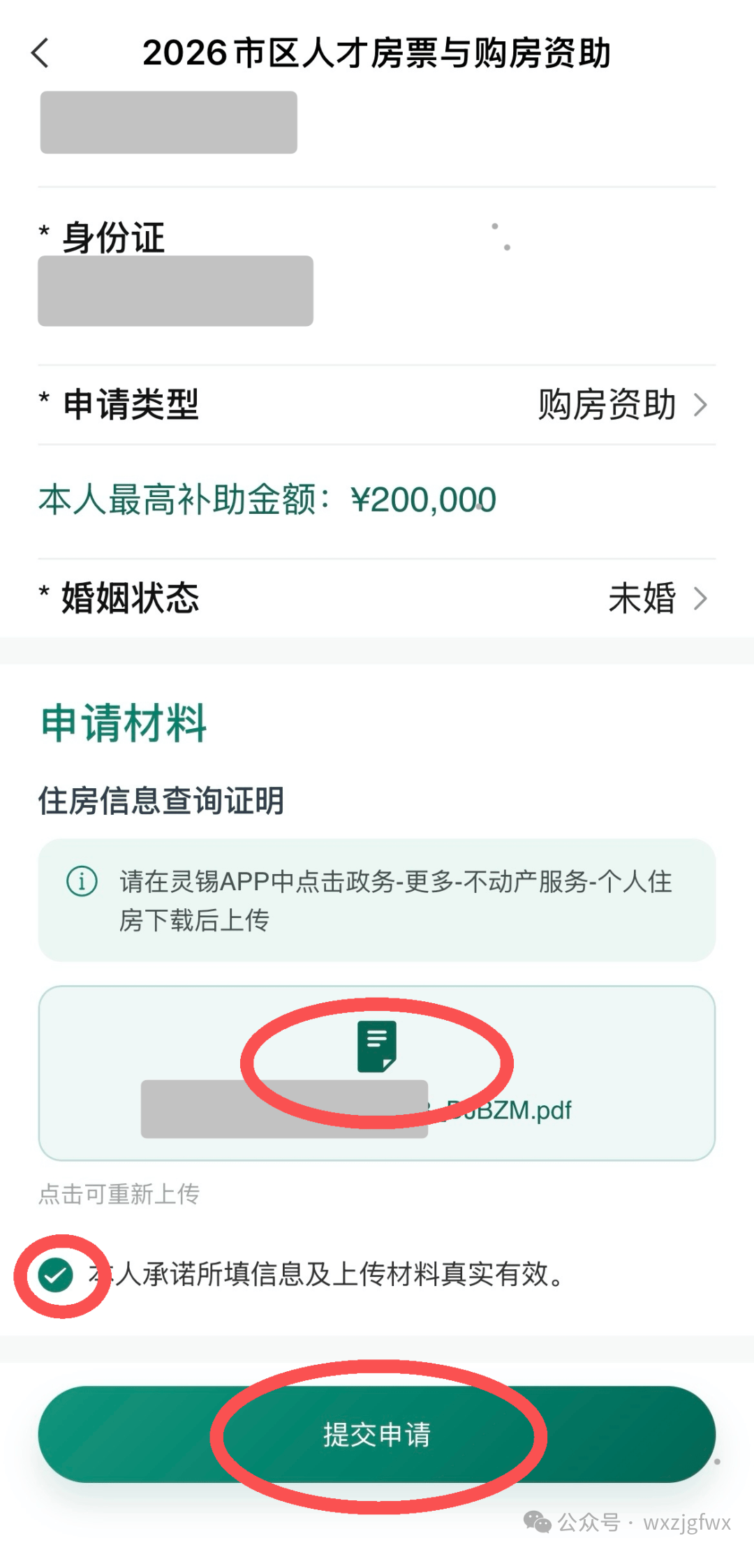 申请人还需上传个人住房信息查询证明,并勾选“承诺所填信息及上传材料真实有效”,申请人确认申报材料全部上传完成后,点击“提交申请”,购房资助申请进入政务审核流程。