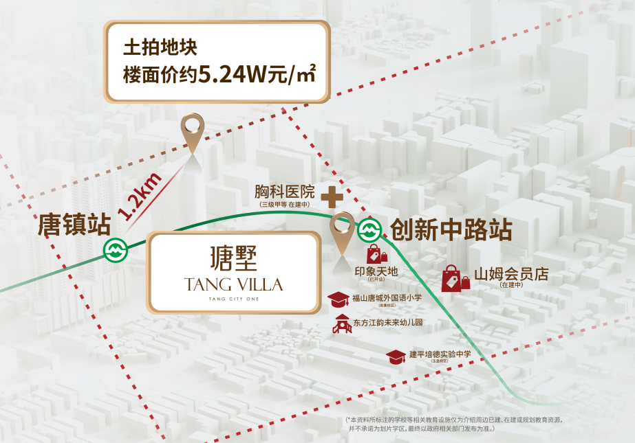 ④此外,唐镇板块正在持续推进城市功能升级,商业、医疗、教育配套已全面落地。印象天地、印象汇已开业,山姆会员店预计2025年底开业;胸科医院临床医学中心计划2026年投用;教育配套包括福山唐城外国语小学、建平培德实验中学等。(*本资料所标注的学校等相关教育设施仅为介绍周边已建、在建或规划教育资源,并不承诺为划片学区。)