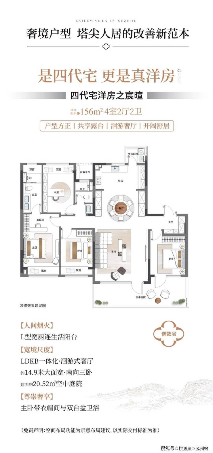 深研苏州当代居者向往,宸庐打造建筑面积约156-190m²四代宅洋房、建筑面积约220-260m²瞰景叠墅、建筑面积约286-316m²隐逸联排,以集锦苏州的现代东方作品,宸启苏州高端住宅封面。