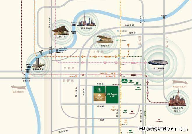 距离中环仅4.5公里,紧临S20环线四桥四隧、双轨枢纽,高架快速路网,约30分钟的车程可抵达新天地、陆家嘴等核心区域,奠定了绿宝园的城市墅区血统。