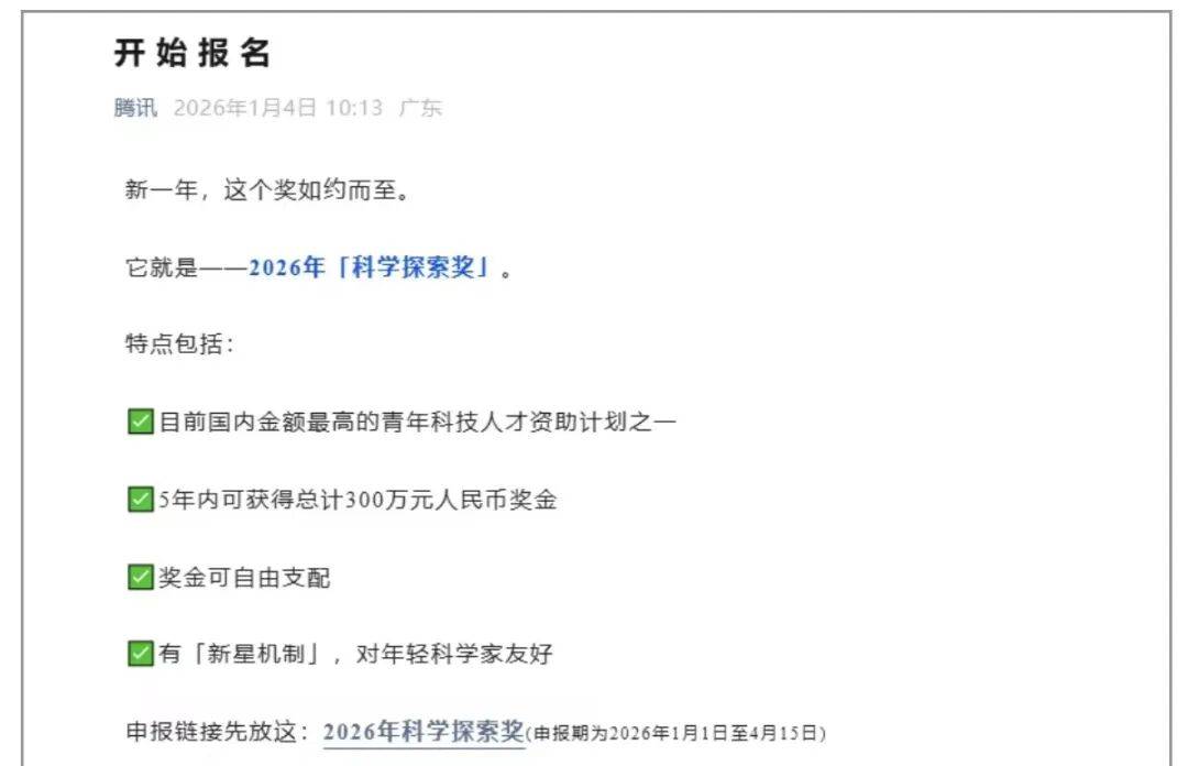 腾讯宣布2026年“科学探索奖”开始报名,这是目前国内金额最高的青年科技人才资助计划之一。每位获奖者将在未来5年内,获得总计300万元人民币奖金,可以自由支配奖金的使用。