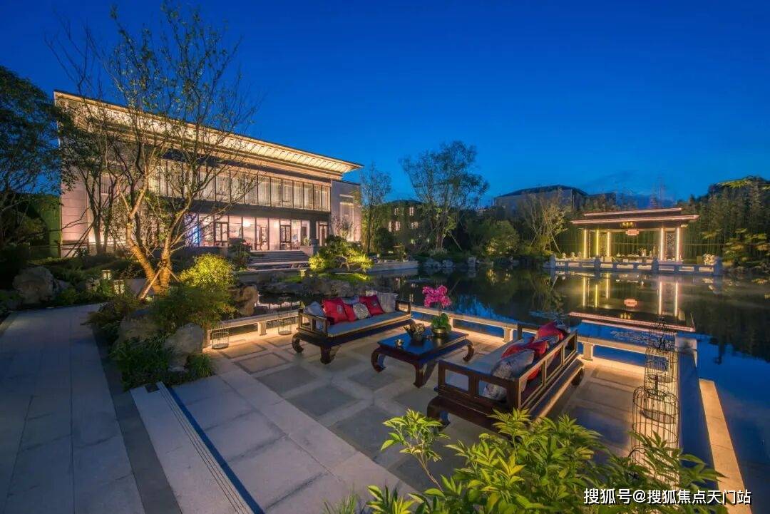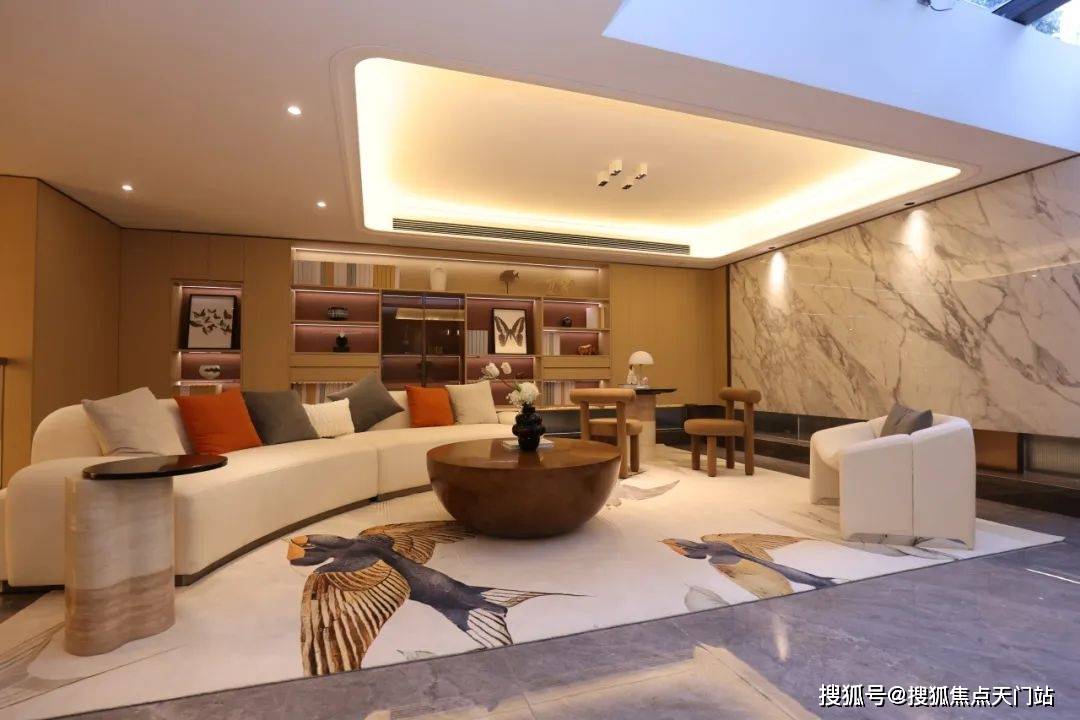 通过优化后的“L型”空间排布,实现了三面有园林环绕,前庭空间尺度非常大,一进门就是约10.2米的大横厅,气派十足,采光也做到极致,日常起居极为从容舒适。