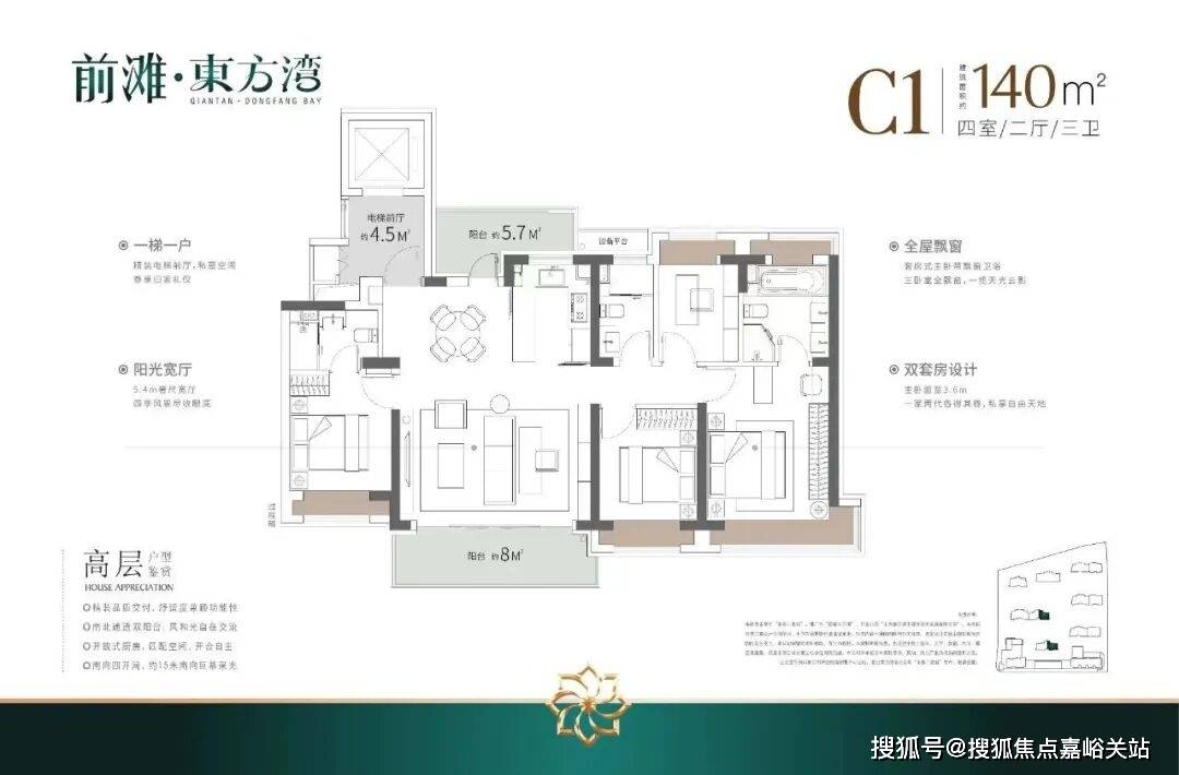 建面约120㎡3房2厅2卫,做到了3开间朝南+双阳台+主卧套房设计+270°转角飘窗