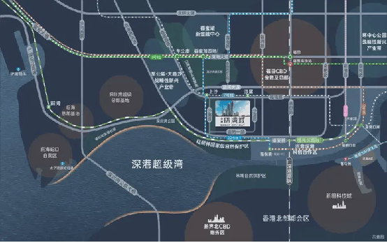 【立体交通 海陆畅达】·双地铁线号线号线双地铁上沙交汇站(规划中),1站直达香蜜湖新金融中心与河套深港创新合作区。·超级口岸:皇岗口岸深度改造,深港唯一24小时陆路通关口岸,3城轨+2地铁,迅捷连通深港河套两地。·联港通沪:沪深高速磁悬浮规划,约2.5h通达沪深,链接“上广深港”南中国超级都会群。·城际轨道:全面覆盖广深科技创新走廊的穗莞深城际铁路,贯通大湾区重要科技核芯;深广中轴城际铁路,直连广深城市中心;香港北环支线,再添深港连通新轨道,便利畅达尖沙咀。