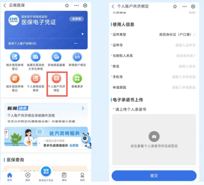 搜索“云南医保”支付宝或微信小程序→授权登录→个人账户→共济绑定→输入使用人(家人)信息→签名→提交(已经绑定过的可以跳过这一步)。